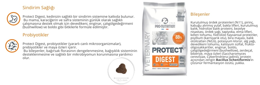 Pro Nutrition Protect Veterinary Digest Hypo-Allergenic Kedi Maması, özel beslenme ihtiyaçları olan kediler için geliştirilmiş tam ve dengeli bir diyetetik kedi mamasıdır. Temel amacı, kedilerde görülen gıda intoleranslarını ve alerjilerini azaltmak, aynı zamanda dermatoz (cilt hastalıkları) ve aşırı tüy dökülmesi durumlarında cilt sağlığını desteklemektir. Mama, hassas sindirim sistemine sahip kediler için de uygundur ve beslenme restorasyonu veya hastalık sonrası nekahet dönemlerinde kullanılabilir.